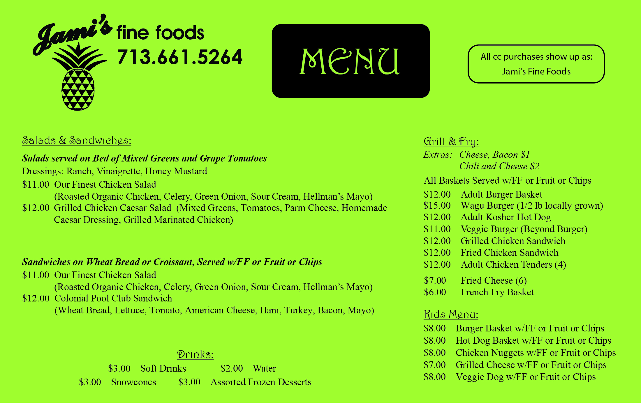 You don’t even have to have a membership to the pool to take advantage of what Jami’s Fine Foods has to offer since you can order and pick up at the side take out window.