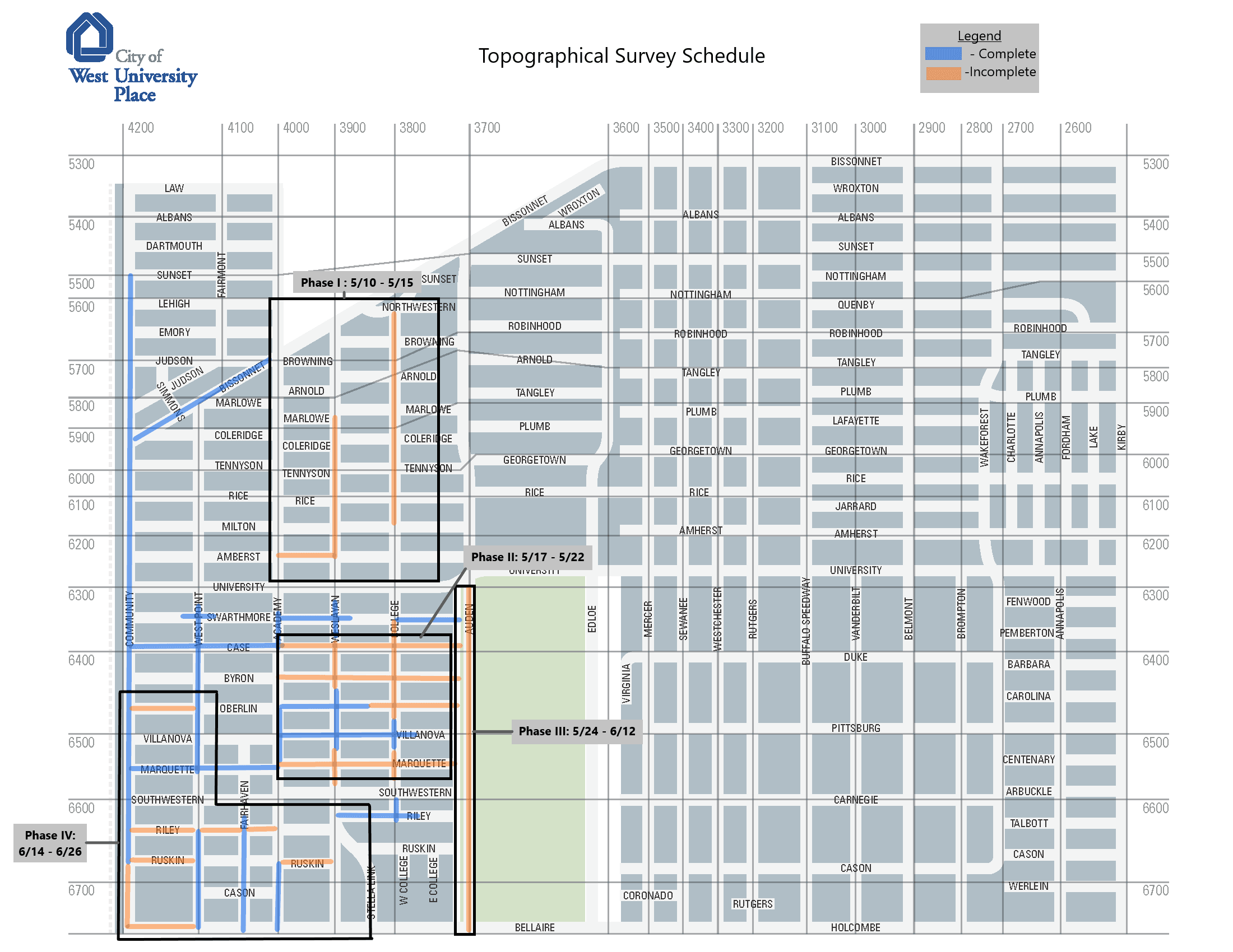 PER East Update 5/12/2021: MBCO Engineering, LLC has completed survey activities along University Boulevard between Buffalo Speedway and Kirby. All surveying work is now complete. Geotest Engineering Inc., has completed the concurrent geotechnical work and is preparing their report.